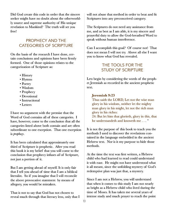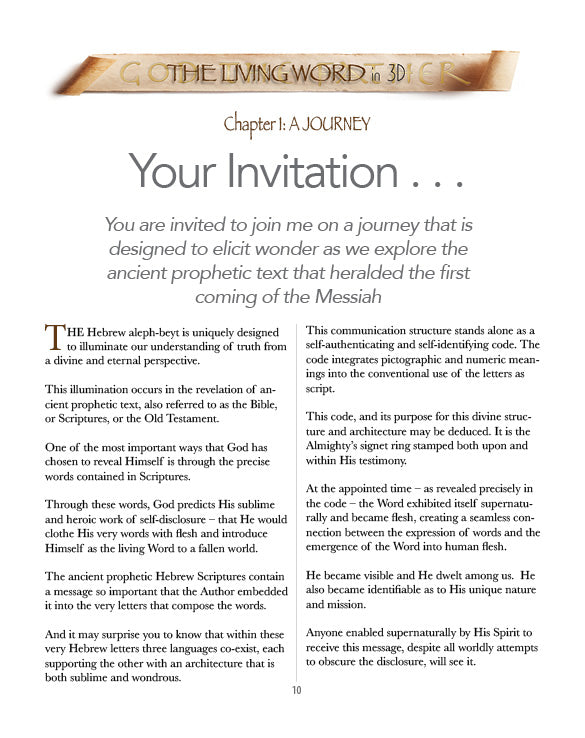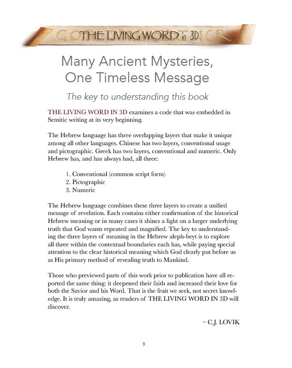 "In The Beginning..." These words have been familiar to millions over millennia. Yet, even after all this time, could there be more to discover in this ancient verse? In this remarkable book, writer C.J. Lovik begins his journey of exploration into a code embedded into the Book of Genesis – a hidden communication that discloses the redemptive plan of God and gives us a portrait of the coming Messiah. Volume One in the Living Word series sets the framework for Lovik's in depth studies.